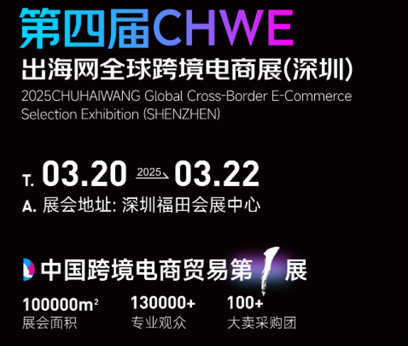 展 会 名 称:第四届 CHWE出海网全球跨境电商展(深圳) 2025 CHUHAIWANG GLOBAL CROSS-BORDER E-COMMERCE SELECTION EXHIBITION(SHENZHEN) 指 导 单 位:深圳市贸促委 支 持 单 位:中国电子商会 主 办 单 位:中国电子商会跨境电商工作委员会、出海网 承 办 单 位:AMZ123、潮域展览 协 办 单 位:潮州贸促会、马来西亚华人行业总会、马来西亚批发商总会、马来西亚玩具及婴童产品行业协会、中国中东投资贸易促进 中心(chinamex)、沙特龙城管理公司、汕头市跨境电子商务协会、南通市跨境电商商会 展 会 时 间:2025年3月20日-3月22日 展 会 地 点:深圳会展中心(福田)