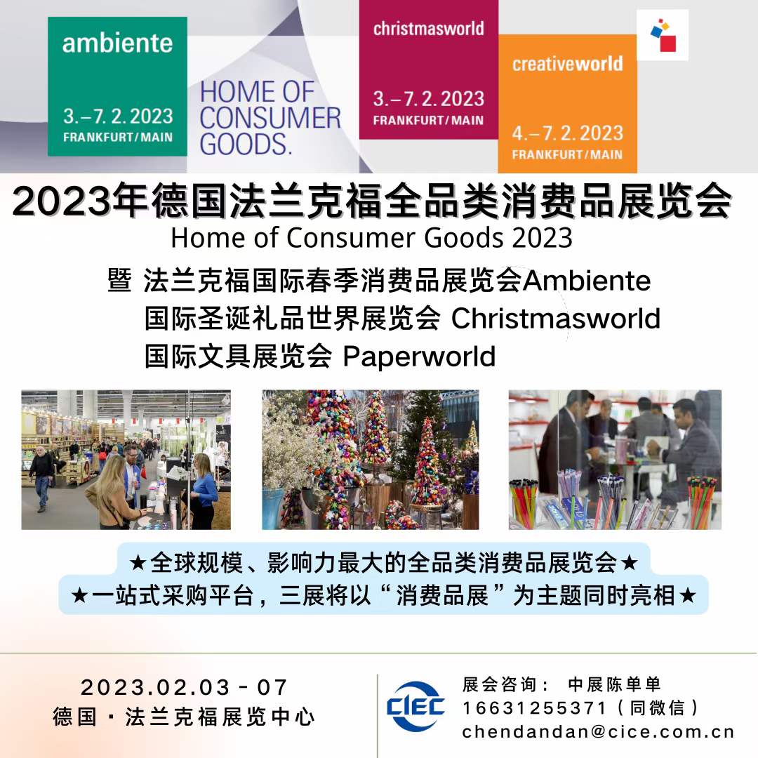 法兰克福展览集团致力为全球消费品产业打造全新平台,积极践行其促进经济发展的使命。集团安排旗下三大消费品展,分别是法兰克福国际春季消费品展览会(Ambiente)、法兰克福国际圣诞礼品世界展览会(Christmasworld)以及法兰克福DIY手工制作及创意文具展(Creativeworld),于2023年2月3/4至7日首次同期在法兰克福展览中心举办。借助“消费品展”三展联办的优势,展会将积极发挥参展商、观众及媒体的协同增效作用,并为行业提供独具特色及的产品类别及解决方案。这三场展会的“全球采购板块”将合并且联合进行国际 ”将合并且联合进行国际 化宣传。与此同时,全新的“设计与生活方式”地区宣传平台将在2023 年下半年于法兰克福举行以满足地方性需求。